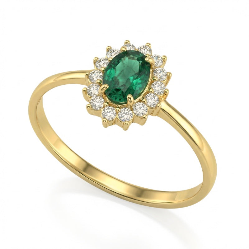Description: Diamond & Emerald Cluster Ring, Set with Oval Cut Emerald & Brilliant Cut Diamonds, Set in 9ct or 18ct Yellow Gold