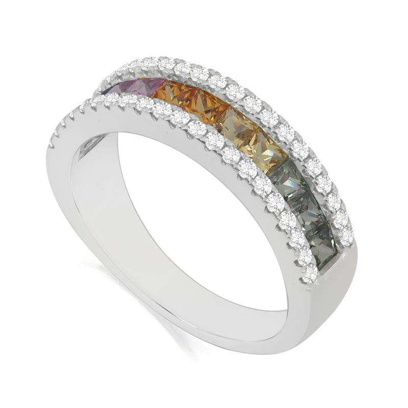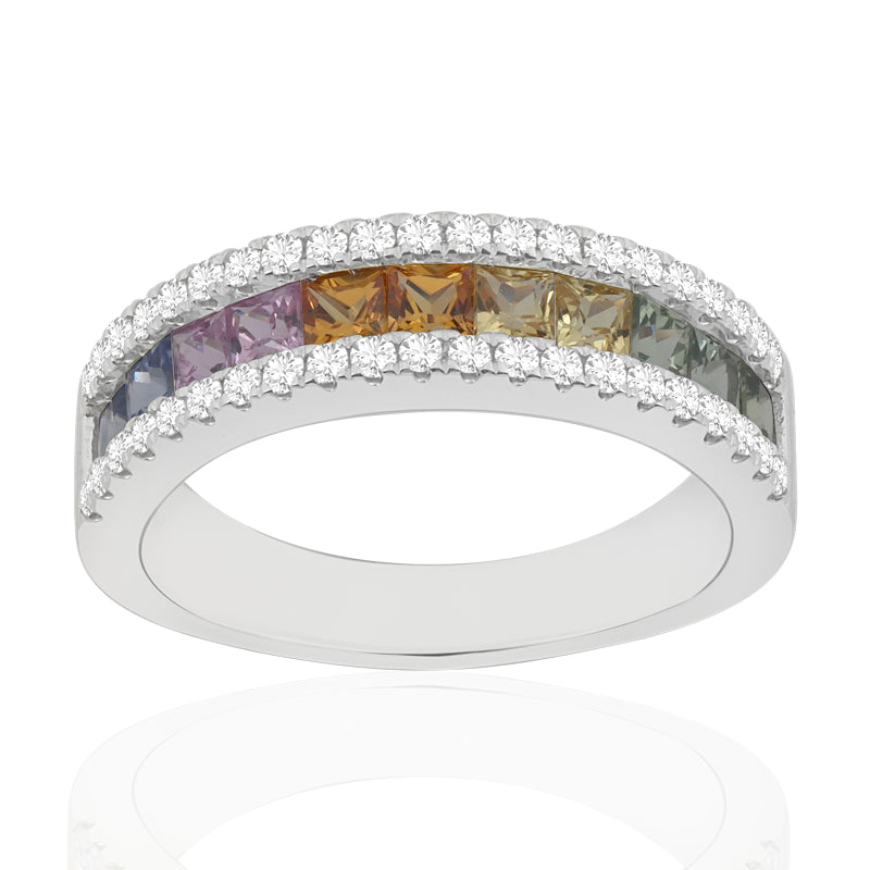 Description: Diamond & Colour Sapphire Ring, Set with Princess Cut Sapphires & Brilliant Cut Diamonds, Set in 9ct or 18ct White Gold