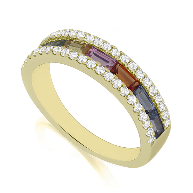 Description: Diamond & Colour Sapphire Ring, Set with Baguette Cut Sapphires & Brilliant Cut Diamonds, Set in 9ct or 18ct Yellow Gold