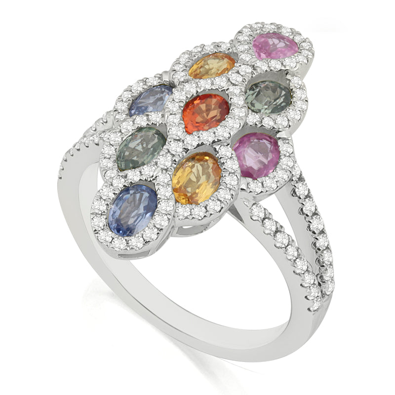 Description: Diamond & Colour Sapphire Ring, Set with Oval Cut Sapphires & Brilliant Cut Diamonds, Set in 9ct or 18ct White Gold