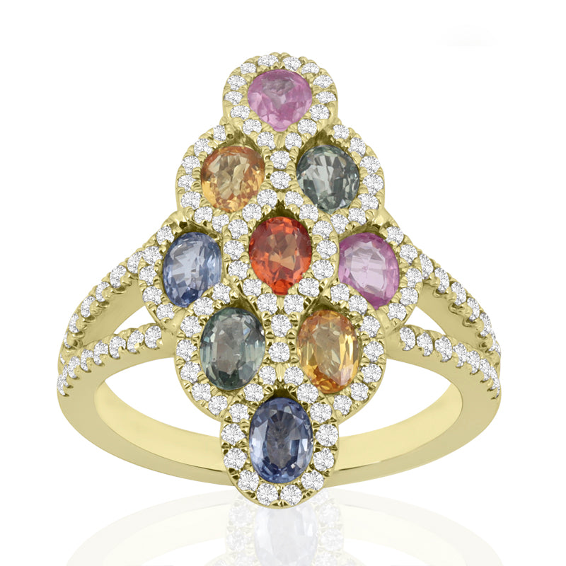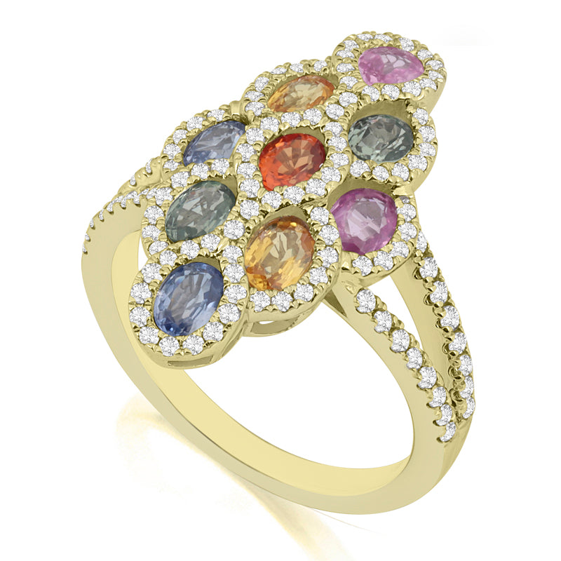 Description: Diamond & Colour Sapphire Ring, Set with Oval Cut Sapphires & Brilliant Cut Diamonds, Set in 9ct or 18ct Yellow Gold