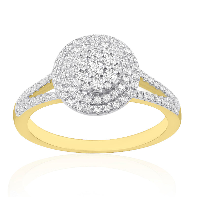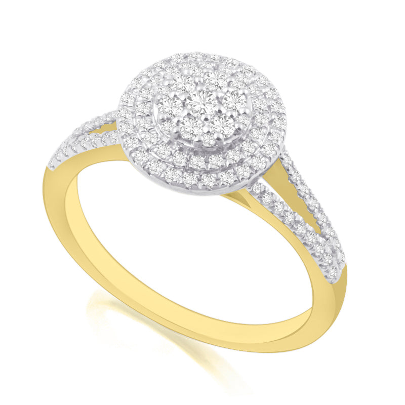 Description: Diamond Cluster Ring, Set with Brilliant Cut Diamonds & Diamond Set Shoulders, Set in 9ct or 18ct Yellow Gold