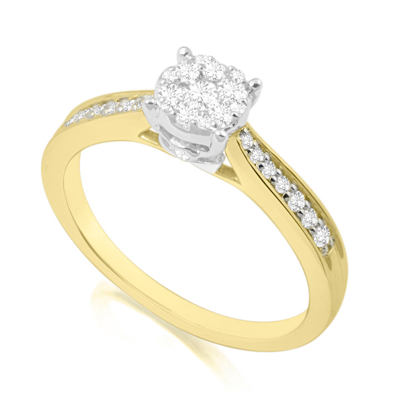 Description: Diamond Solitaire/Cluster Ring, Set with Brilliant Cut Diamonds & Diamond Set Shoulders, Set in 9ct or 18ct Yellow Gold