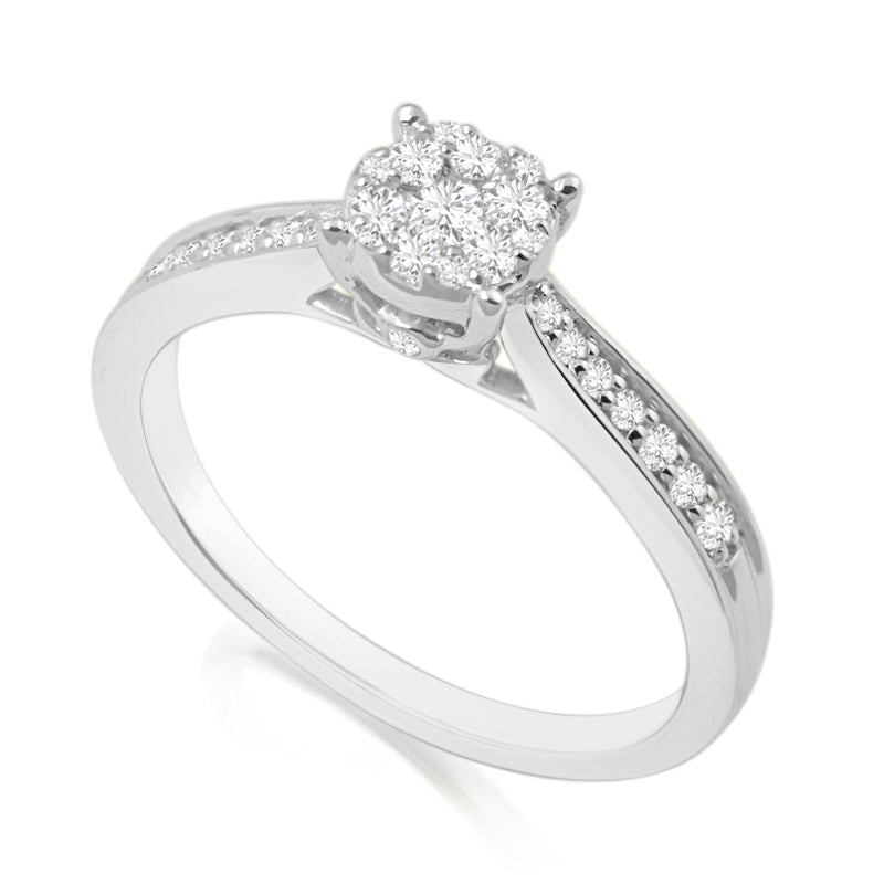 Description: Diamond Solitaire/Cluster Ring, Set with Brilliant Cut Diamonds & Diamond Set Shoulders, Set in 9ct or 18ct White Gold