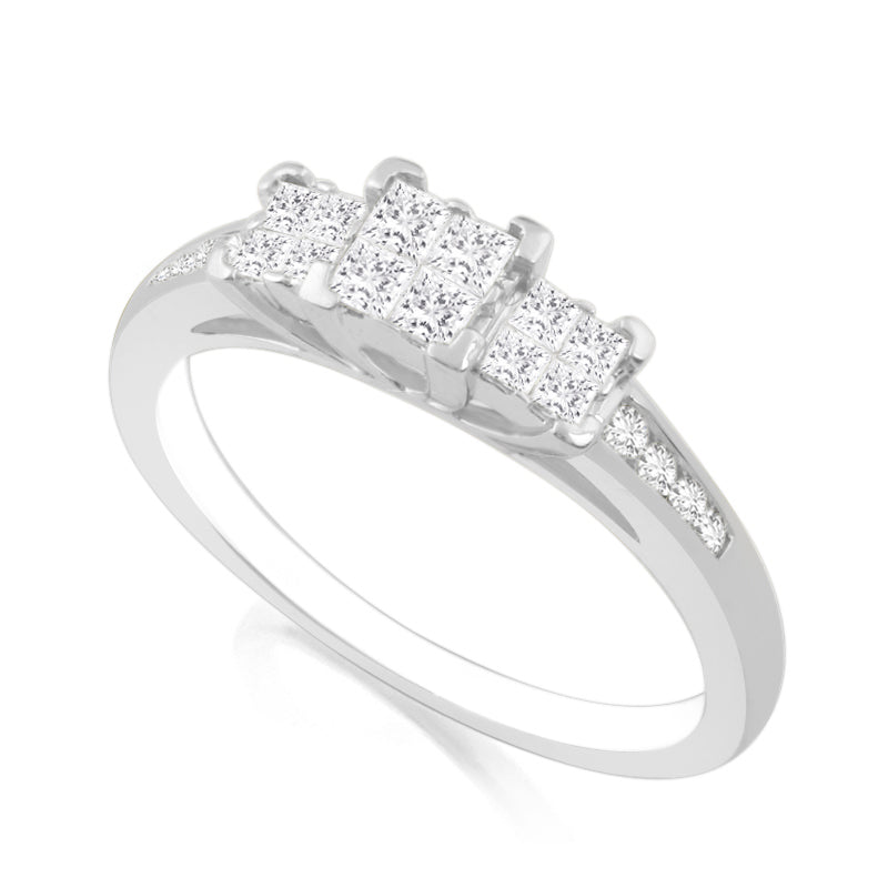 Description: Diamond Dress Ring, Set with Princess Cut Diamonds & Diamond Set Shoulders, Set in 9ct or 18ct White Gold
