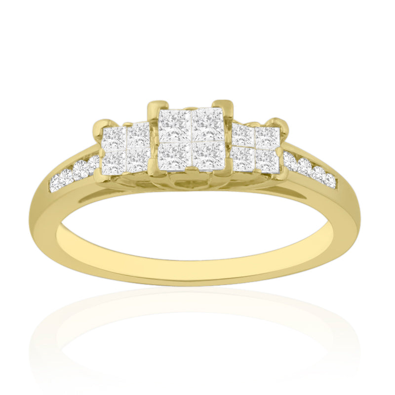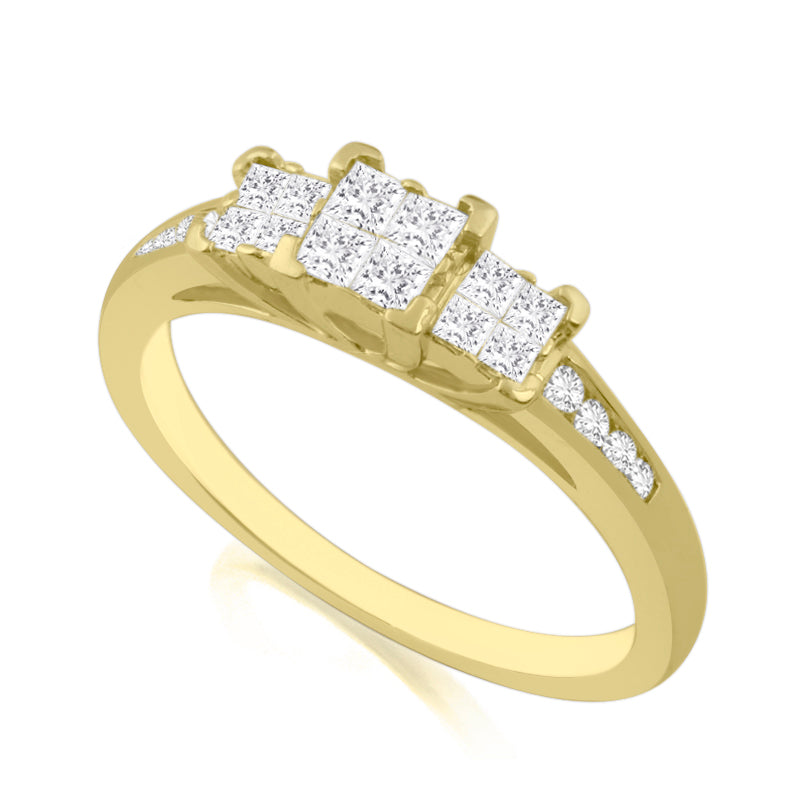 Description: Diamond Dress Ring, Set with Princess Cut Diamonds & Diamond Set Shoulders, Set in 9ct or 18ct Yellow Gold