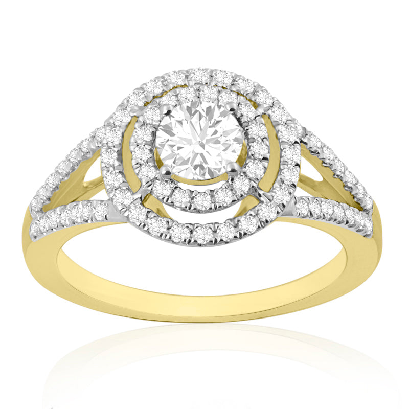 Description: Diamond Double Halo Cluster Ring, Set with Brilliant Cut Diamonds, Set in 9ct or 18ct Yellow Gold