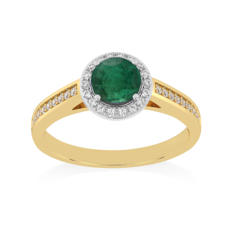 Description: Diamond & Emerald Halo Ring, Set with Round Cut Emerald & Brilliant Cut Diamonds, Set in 9ct or 18ct Yellow Gold