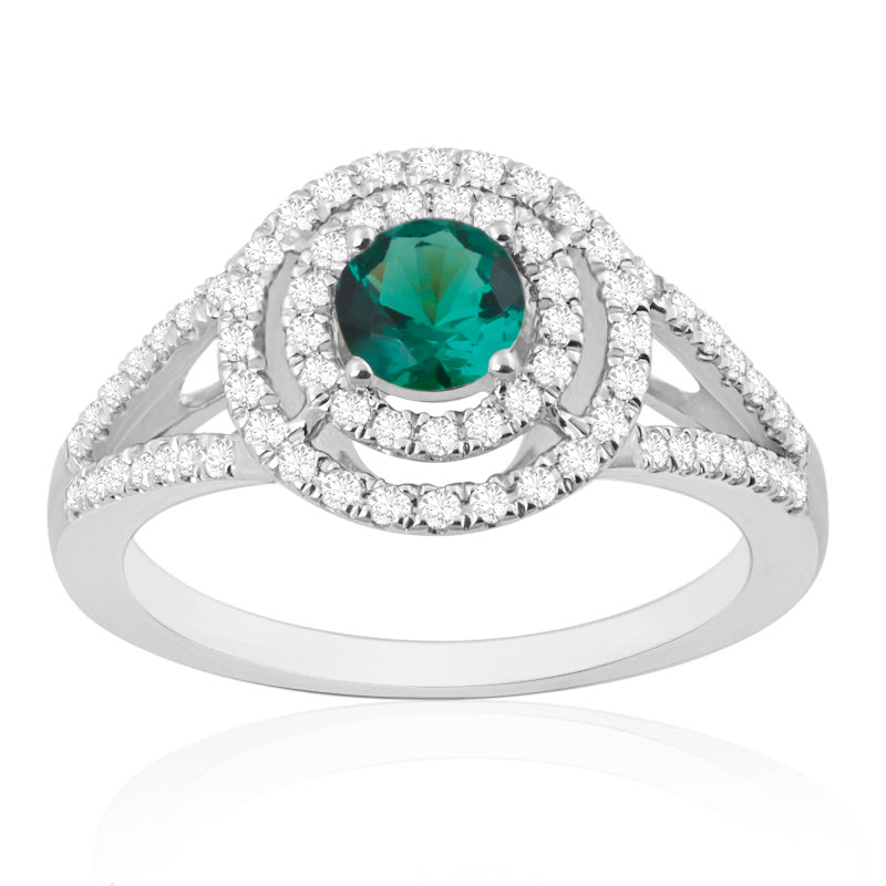 Description: Diamond & Emerald Double Halo Cluster Ring, Set with Round Cut Emerald & Brilliant Cut Diamonds, Set in 9ct or 18ct White Gold