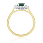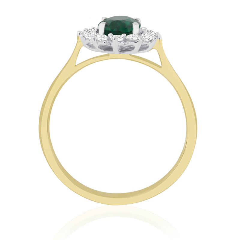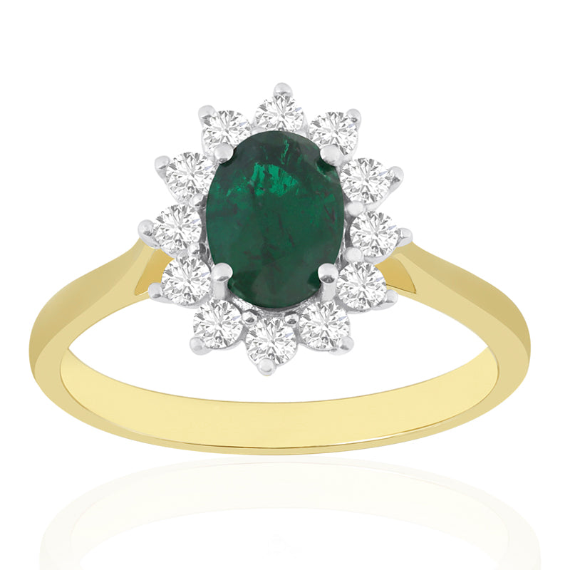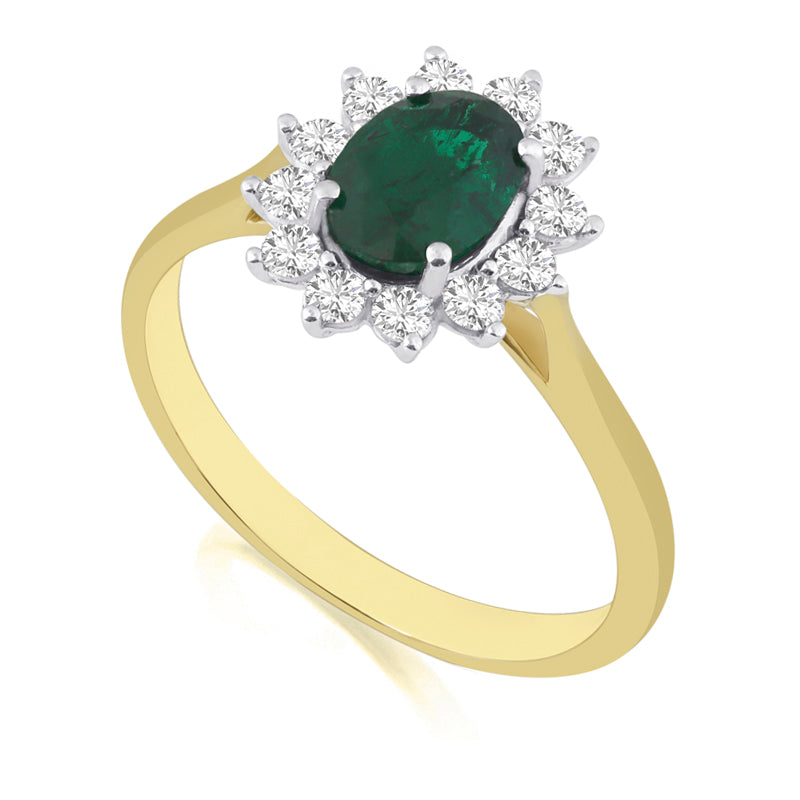 Description: Diamond & Emerald Cluster Ring, Set with Oval Cut Emerald & Twelve Brilliant Cut Diamonds, Set in 9ct or 18ct Yellow Gold
