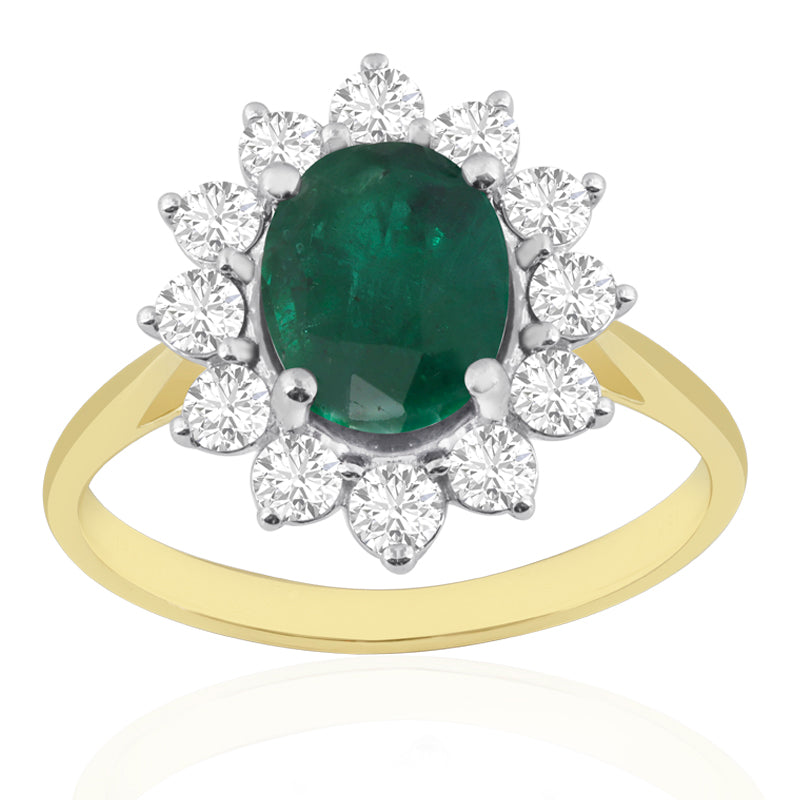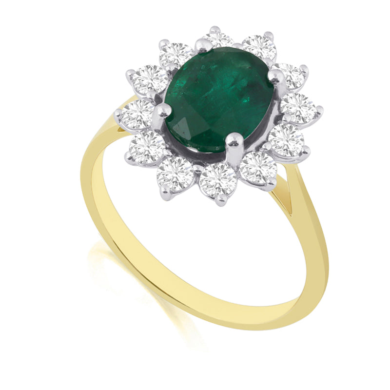 Description: Diamond & Emerald Cluster Ring, Set with Oval Cut Emerald & Twelve Brilliant Cut Diamonds, Set in 18ct Yellow Gold