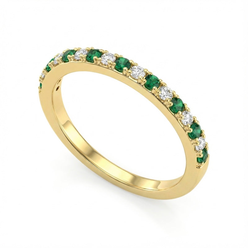 Description: Diamond & Emerald Half Eternity Ring, Set with Round Emeralds & Brilliant Cut Diamonds, Set in 9ct or 18ct Yellow Gold