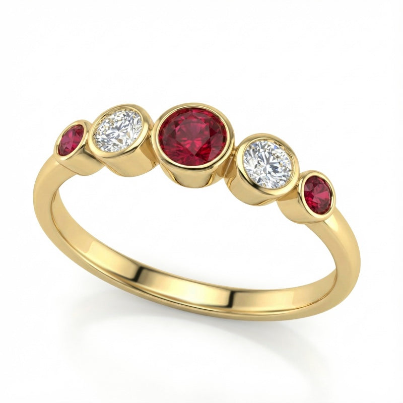 Description: Diamond & Ruby Five Stone Ring, Set with Three Round Rubies & Two Brilliant Cut Diamonds in a Rubover Setting, Set in 9ct or 18ct Yellow Gold