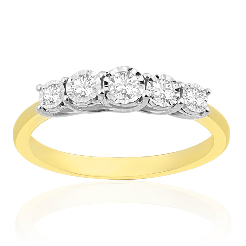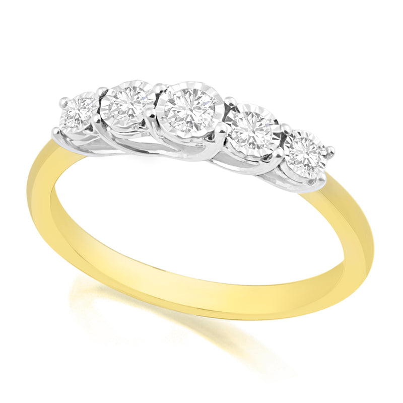 Description: Diamond Five Stone Ring, Set with Five Brilliant Cut Diamonds in Star Bright Setting, Set in 9ct or 18ct Yellow Gold