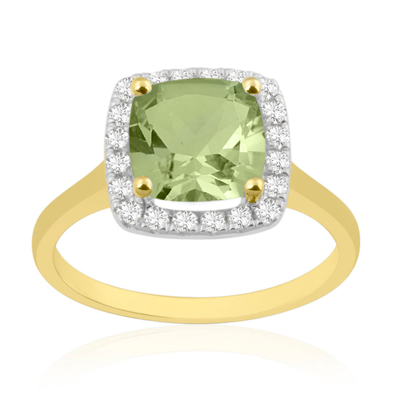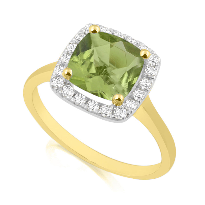 Description: Diamond & Peridot Cluster Ring, Set with Cushion Cut Peridot & Brilliant Cut Diamonds, Set in 9ct or 18ct Yellow Gold