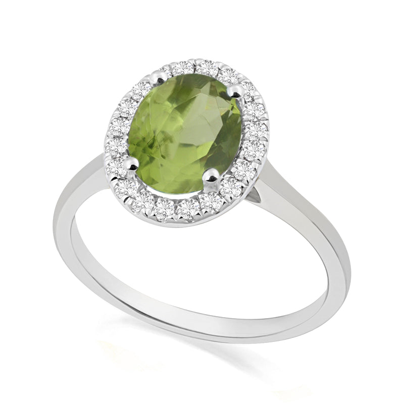 Description: Diamond & Peridot Cluster Ring, Set with Oval Cut Peridot & Brilliant Cut Diamonds, Set in 9ct or 18ct White Gold or Platinum
