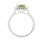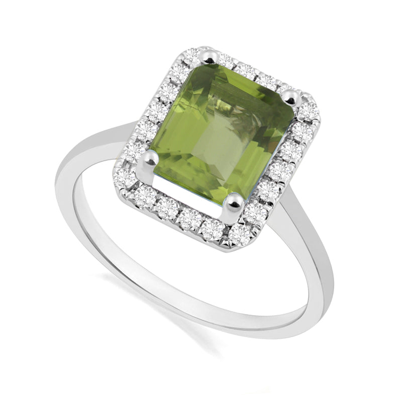 Description: Diamond & Peridot Cluster Ring, Set with Emerald Cut Peridot & Brilliant Cut Diamonds, Set in 9ct or 18ct White Gold or Platinum