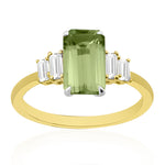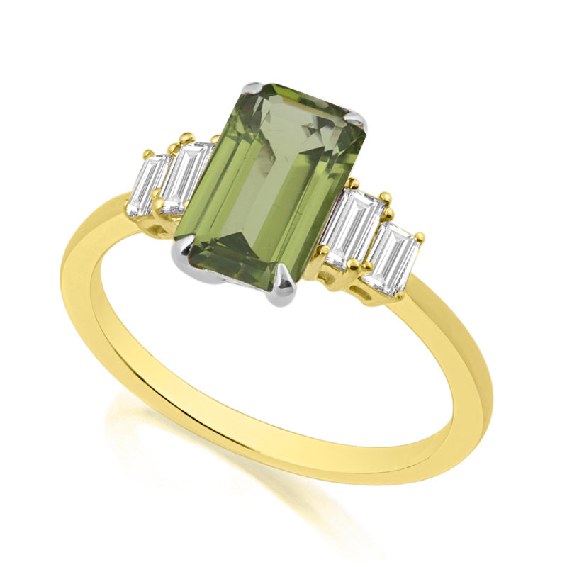 Description: Diamond & Peridot Dress Ring, Set with Octagon Cut Peridot & Four Baguette Cut Diamonds, Set in 9ct or 18ct Yellow Gold