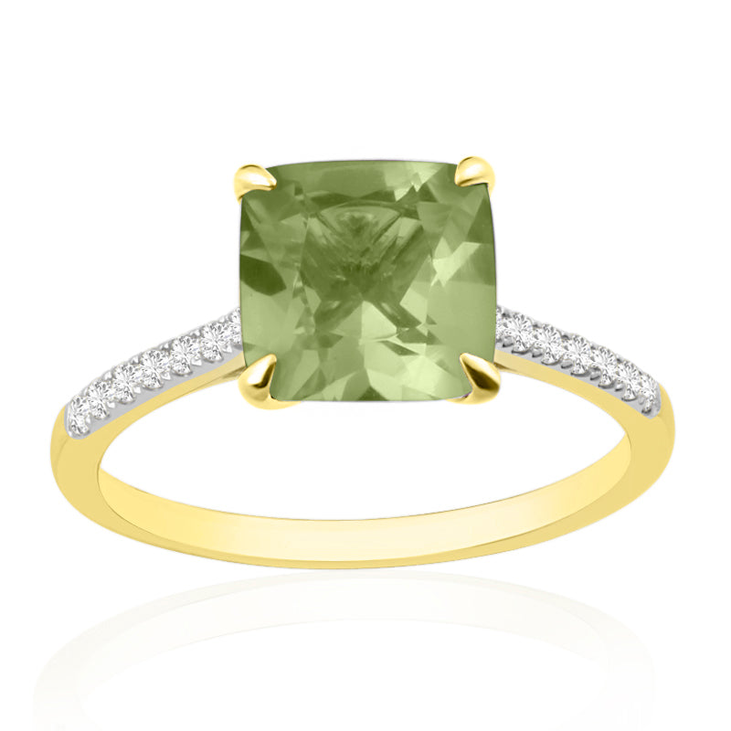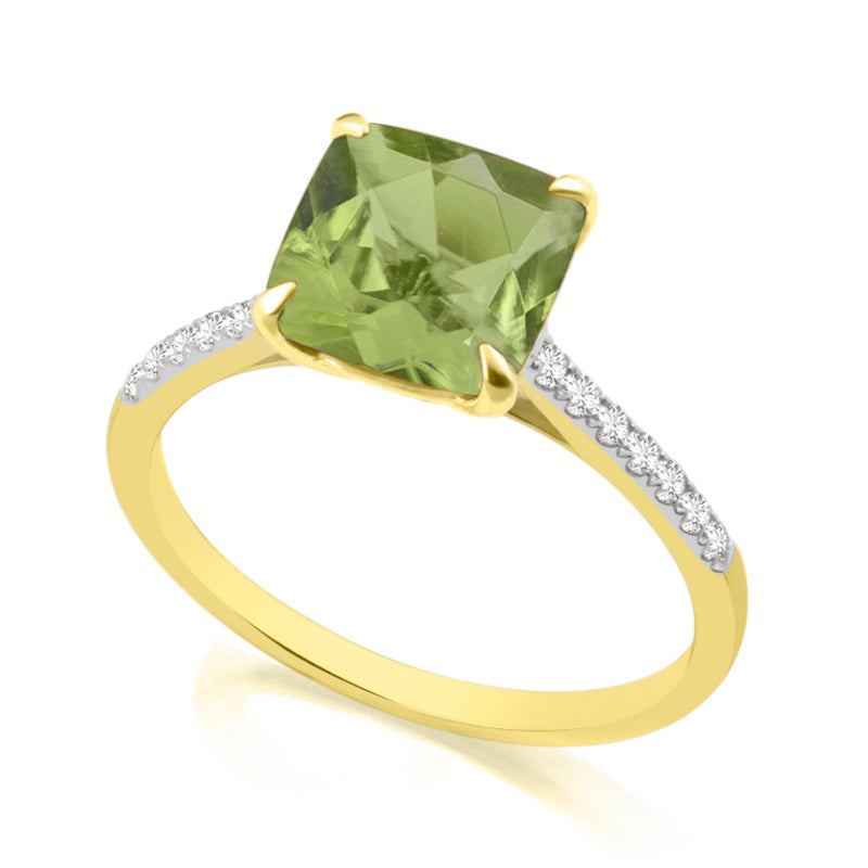 Description: Diamond & Peridot Dress Ring, Set with Cushion Cut Peridot & Brilliant Cut Diamonds, Set in 9ct or 18ct Yellow Gold