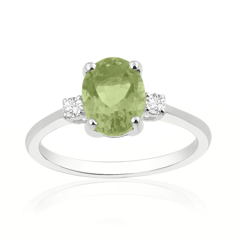 Description: Diamond & Peridot Three Stone Ring, Set with Oval Cut Peridot & Two Brilliant Cut Diamonds, Set in 9ct or 18ct White Gold or Platinum