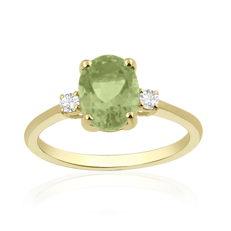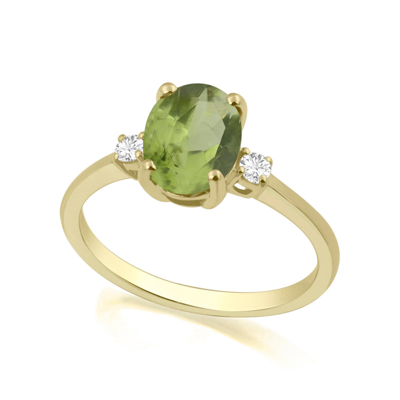 Description: Diamond & Peridot Three Stone Ring, Set with Oval Cut Peridot & Two Brilliant Cut Diamonds, Set in 9ct or 18ct Yellow Gold