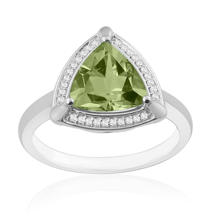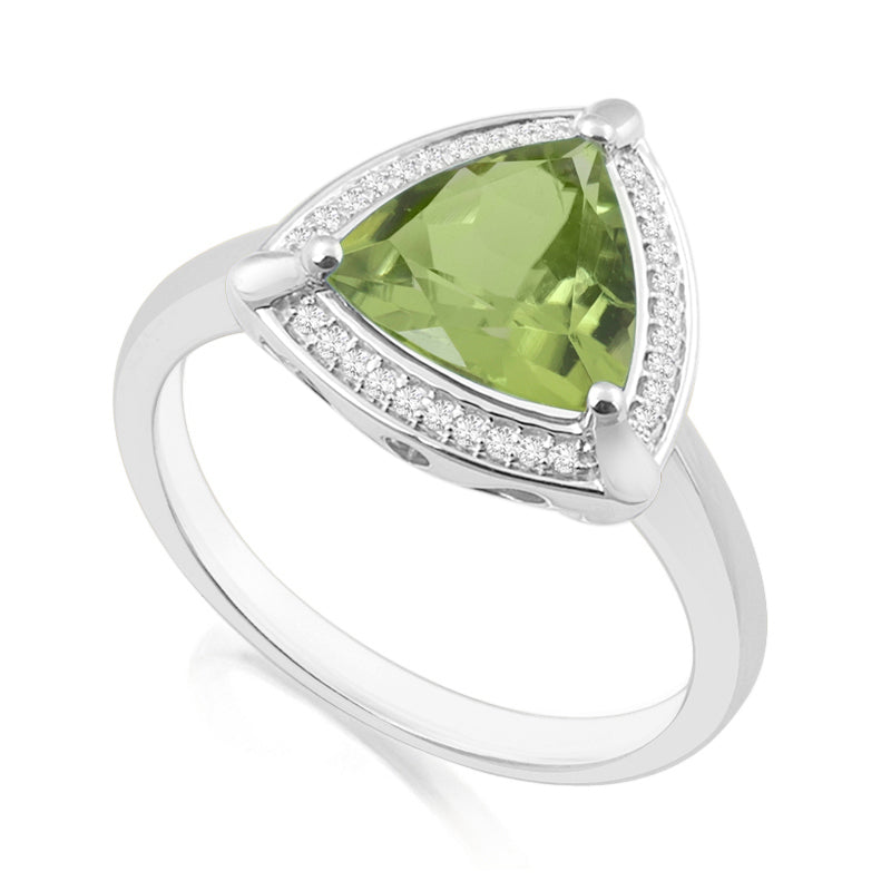 Description: Diamond & Peridot Cluster Ring, Set with Trillion Cut Peridot & Brilliant Cut Diamonds, Set in 9ct or 18ct White Gold