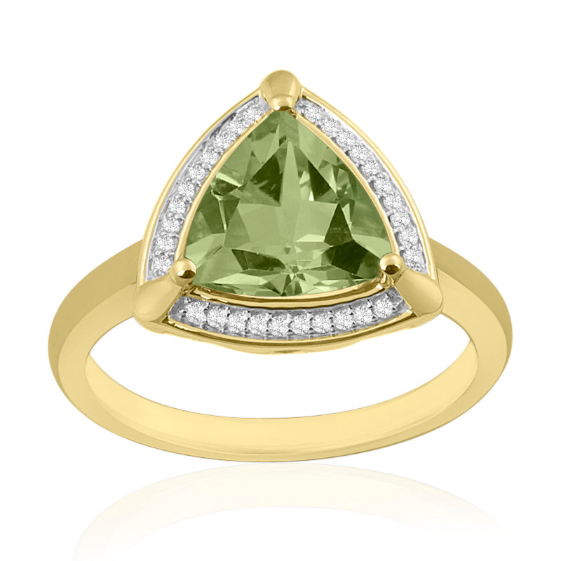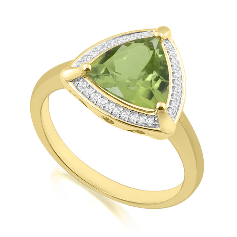 Description: Diamond & Peridot Cluster Ring, Set with Trillion Cut Peridot & Brilliant Cut Diamonds, Set in 9ct or 18ct Yellow Gold