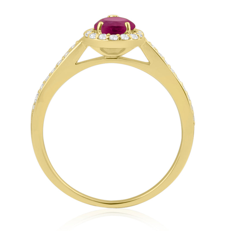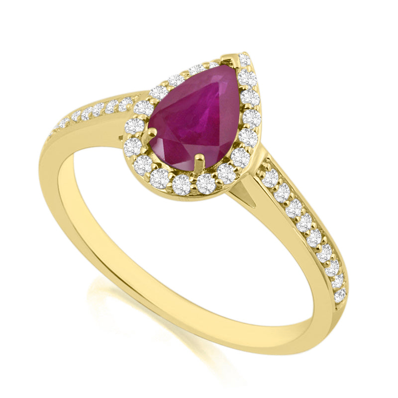 Description: Diamond & Ruby Halo Ring, Set with Pear Cut Ruby & Brilliant Cut Diamonds, Set in 18ct Yellow Gold