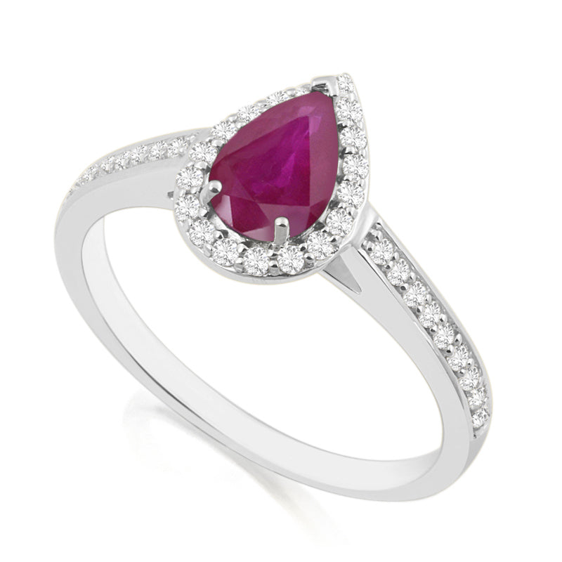 Description: Diamond & Ruby Halo Ring, Set with Pear Cut Ruby & Brilliant Cut Diamonds, Set in 9ct or 18ct White Gold