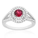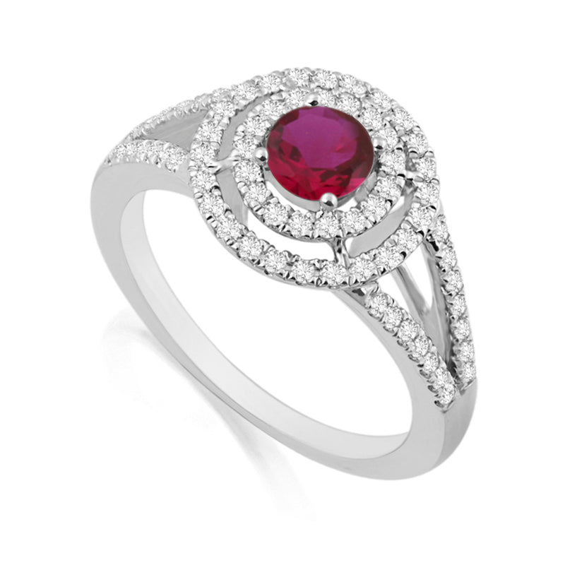 Description: Diamond & Ruby Double Halo Cluster Ring, Set with Round Cut Ruby & Brilliant Cut Diamonds, Set in 9ct or 18ct White Gold