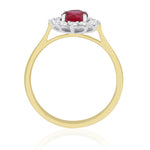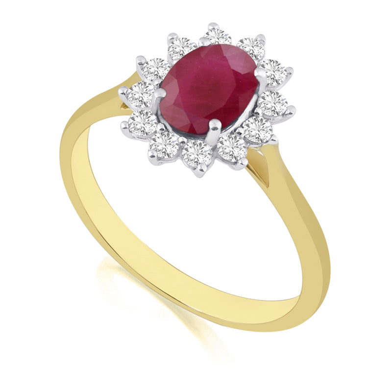 Description: Diamond & Ruby Cluster Ring, Set with Oval Cut Ruby & Twelve Brilliant Cut Diamonds, Set in 9ct or 18ct Yellow Gold