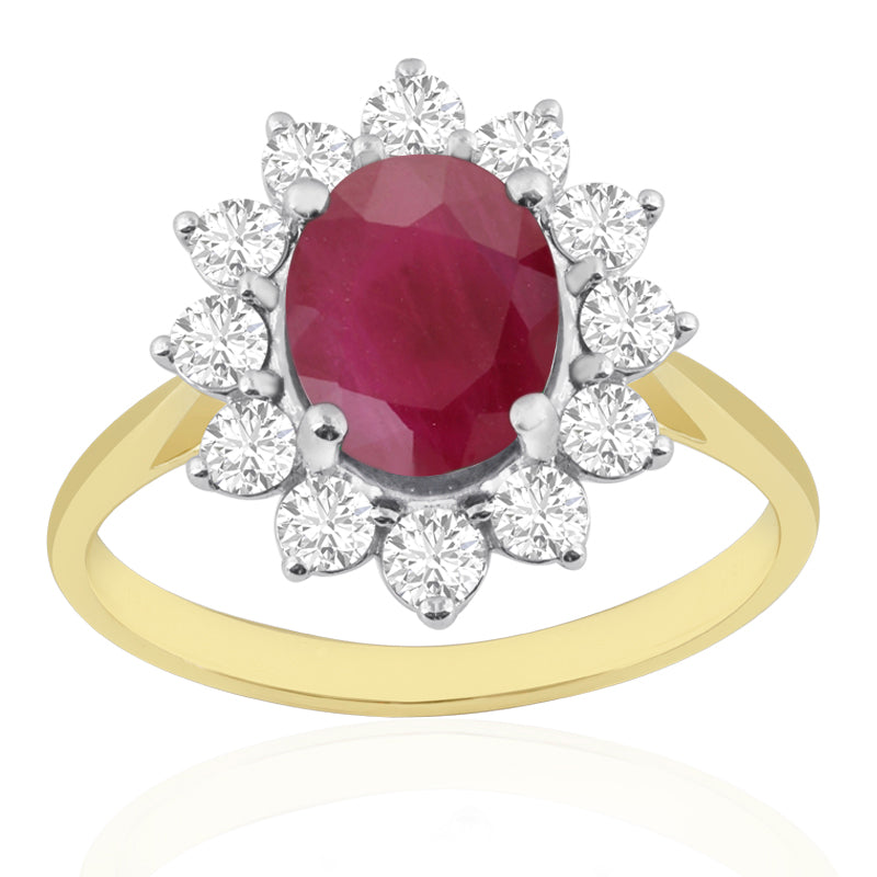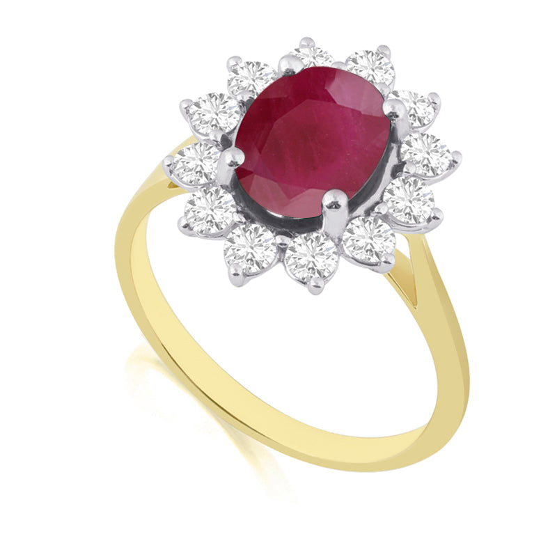 Description: Diamond & Ruby Cluster Ring, Set with Oval Cut Ruby & Twelve Brilliant Cut Diamonds, Set in 18ct Yellow Gold