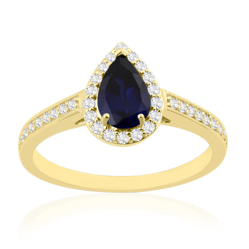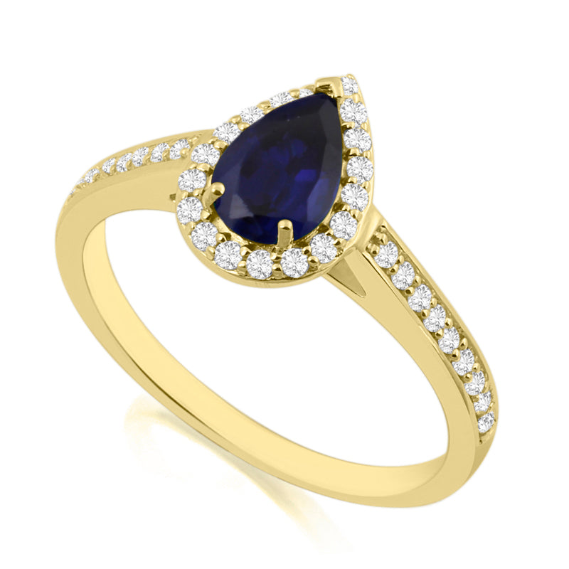 Description: Diamond & Sapphire Halo Ring, Set with Pear Cut Sapphire & Brilliant Cut Diamonds, Set in 18ct Yellow Gold