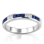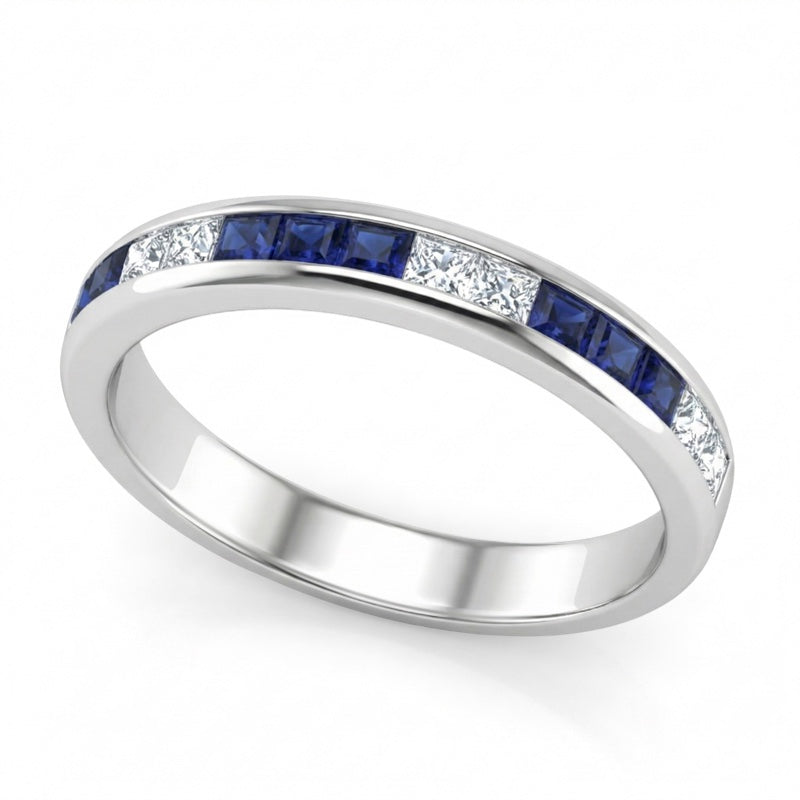 Description: Diamond & Sapphire Half Eternity Ring, Set with Square Cut Sapphires & Brilliant Cut Diamonds, Set in 9ct or 18ct White Gold or Platinum