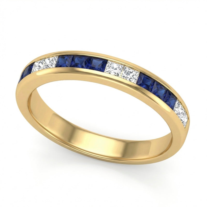 Description: Diamond & Sapphire Half Eternity Ring, Set with Square Cut Sapphires & Brilliant Cut Diamonds, Set in 9ct or 18ct Yellow Gold