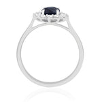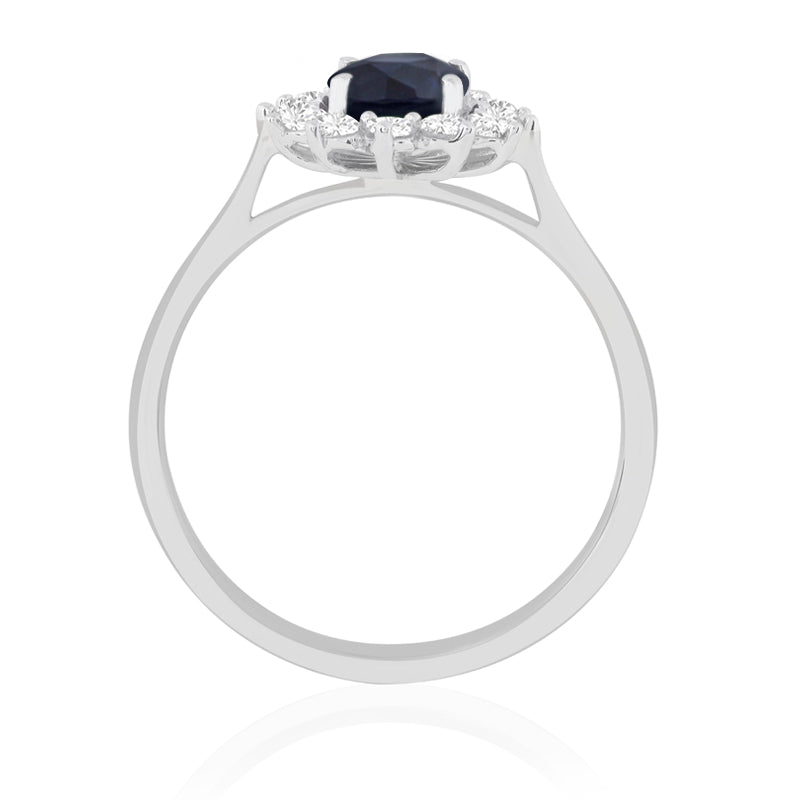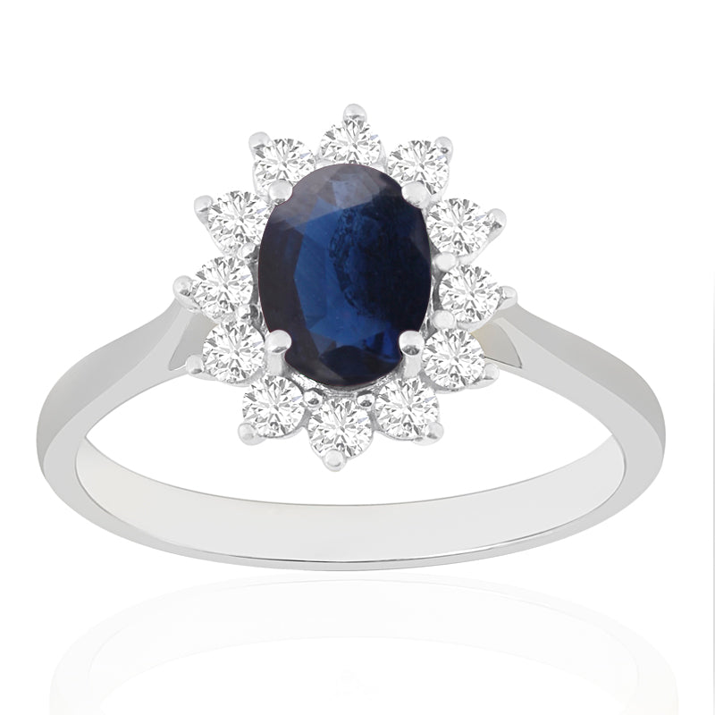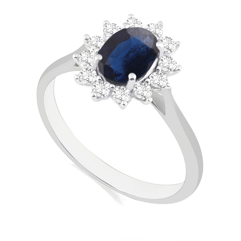 Description: Diamond & Sapphire Cluster Ring, Set with Oval Cut Sapphire & Twelve Brilliant Cut Diamonds, Set in 9ct or 18ct White Gold or Platinum