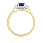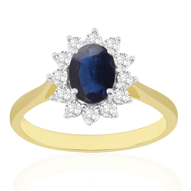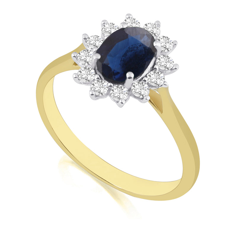 Description: Diamond & Sapphire Cluster Ring, Set with Oval Cut Sapphire & Twelve Brilliant Cut Diamonds, Set in 9ct or 18ct Yellow Gold