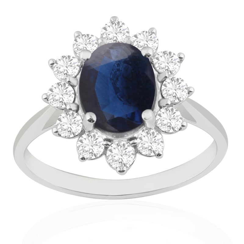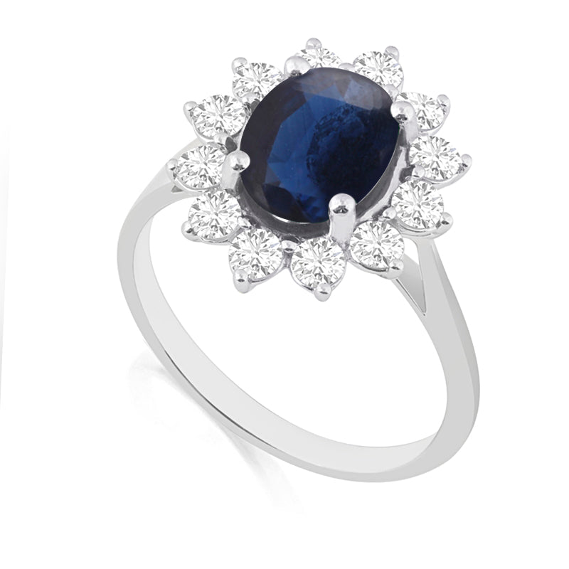 Description: Diamond & Sapphire Cluster Ring, Set with Oval Cut Sapphire & Twelve Brilliant Cut Diamonds, Set in 18ct White Gold or Platinum