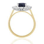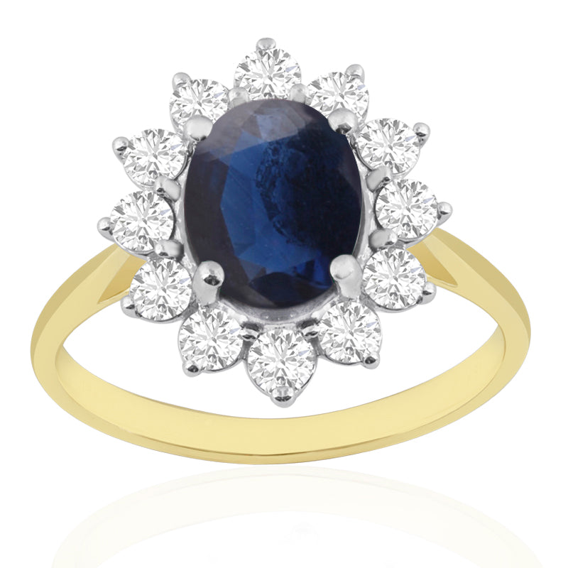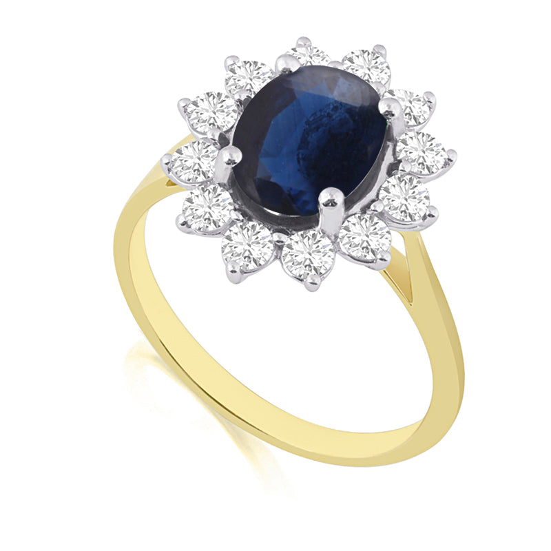 Description: Diamond & Sapphire Cluster Ring, Set with Oval Cut Sapphire & Twelve Brilliant Cut Diamonds, Set in 18ct Yellow Gold