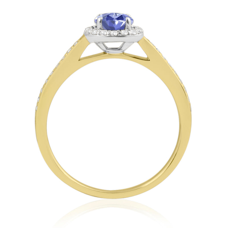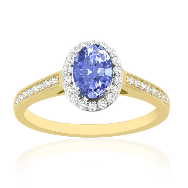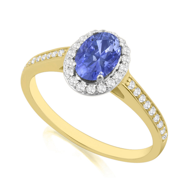 Description: Diamond & Tanzanite Halo Ring, Set with Oval Cut Tanzanite & Brilliant Cut Diamonds, Set in 9ct or 18ct Yellow Gold