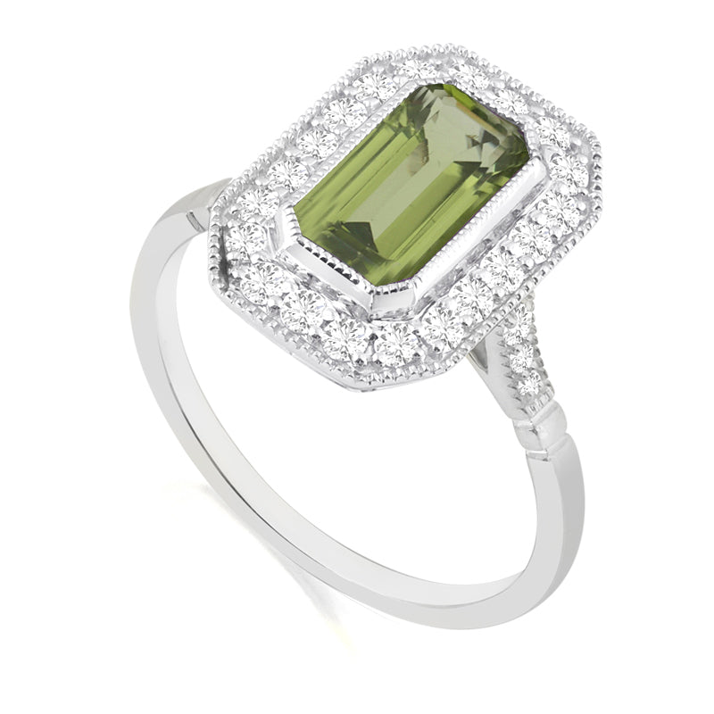 Description: Diamond & Peridot Vintage Ring, Set with Octagon Cut Peridot & Baguette Cut & Brilliant Cut Diamonds, Set in 9ct or 18ct White Gold or Platinum