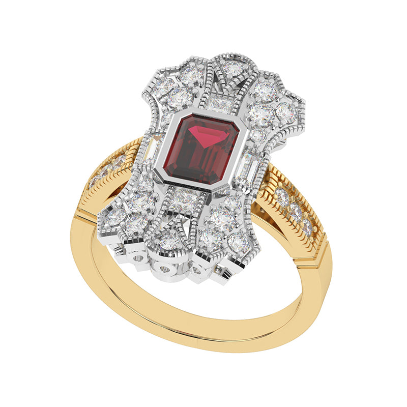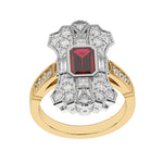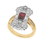 Description: Diamond & Ruby Vintage Ring, Set with Octagon Ruby & Baguette-Cut, Princess-Cut & Brilliant-Cut Diamonds, Set in 9ct or 18ct Yellow Gold