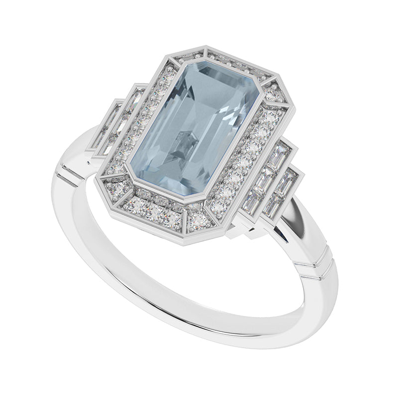 Description: Diamond & Blue Topaz Vintage Ring, Set with Octagon Cut Blue Topaz & Baguette Cut & Brilliant Cut Diamonds, Set in 9ct or 18ct White Gold