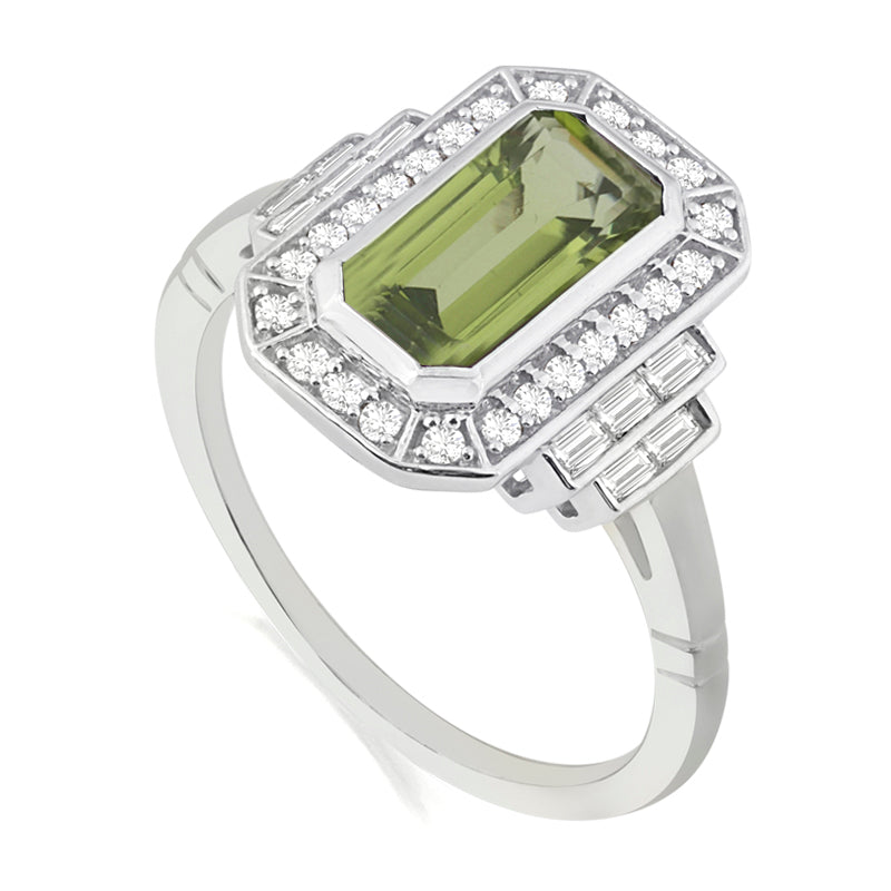 Description: Diamond & Peridot Vintage Ring, Set with Octagon Cut Peridot & Baguette Cut & Brilliant Cut Diamonds, Set in 9ct or 18ct White Gold or Platinum