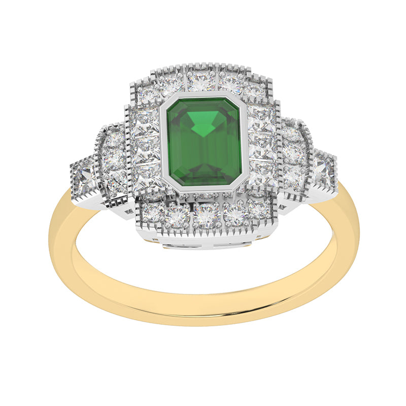 Description: Diamond & Emerald Vintage Ring, Set with Octagon Cut Emerald & Princess Cut & Brilliant Cut Diamonds, Set in 9ct or 18ct Yellow Gold