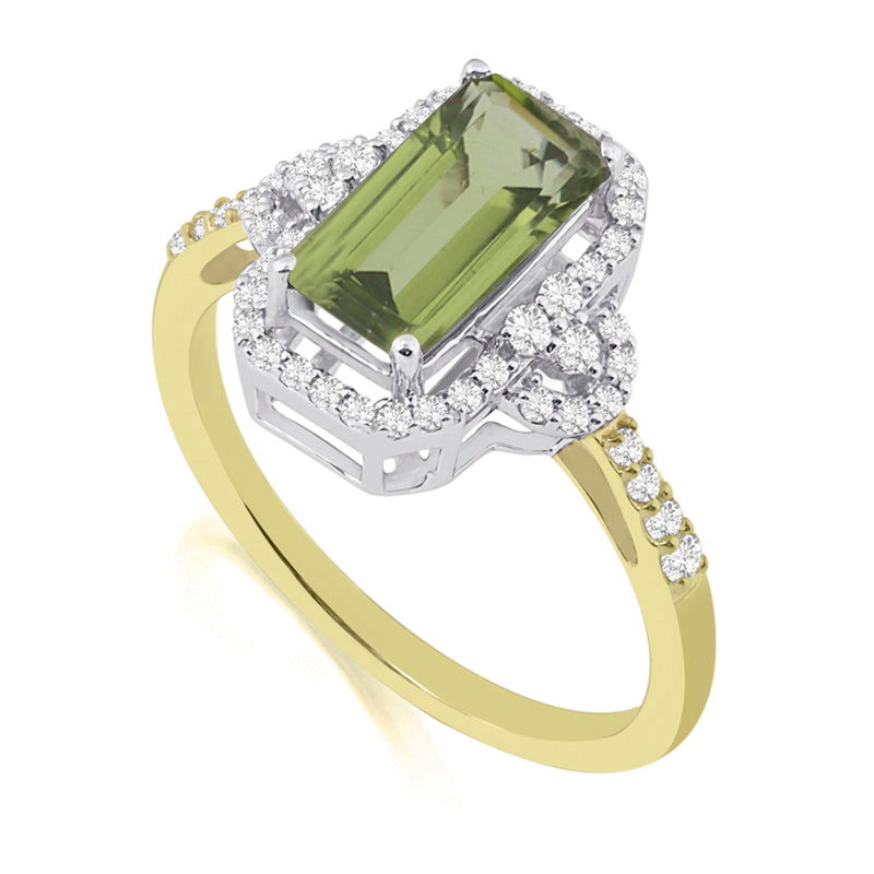 Description: Diamond & Peridot Vintage Ring, Set with Octagon Cut Peridot & Brilliant Cut Diamonds, Set in 9ct or 18ct Yellow Gold