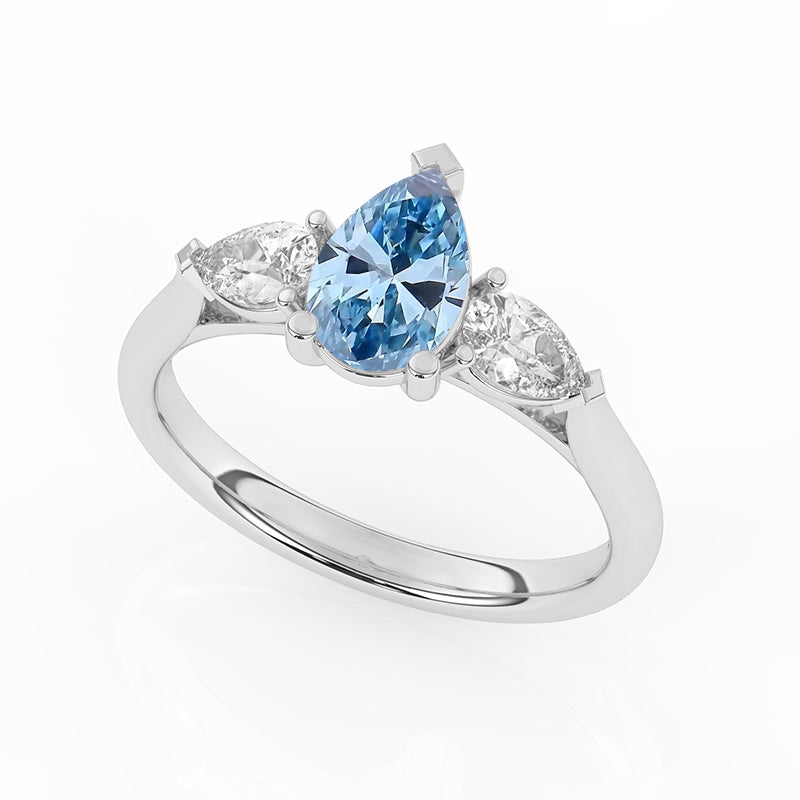 Description: Diamond Three Stone Ring, Set with Pear Cut Lab Blue Diamond & Two Pear Cut Lab Diamonds, Set in 9ct or 18ct White Gold or Platinum (Verifiably IGI Report Included)