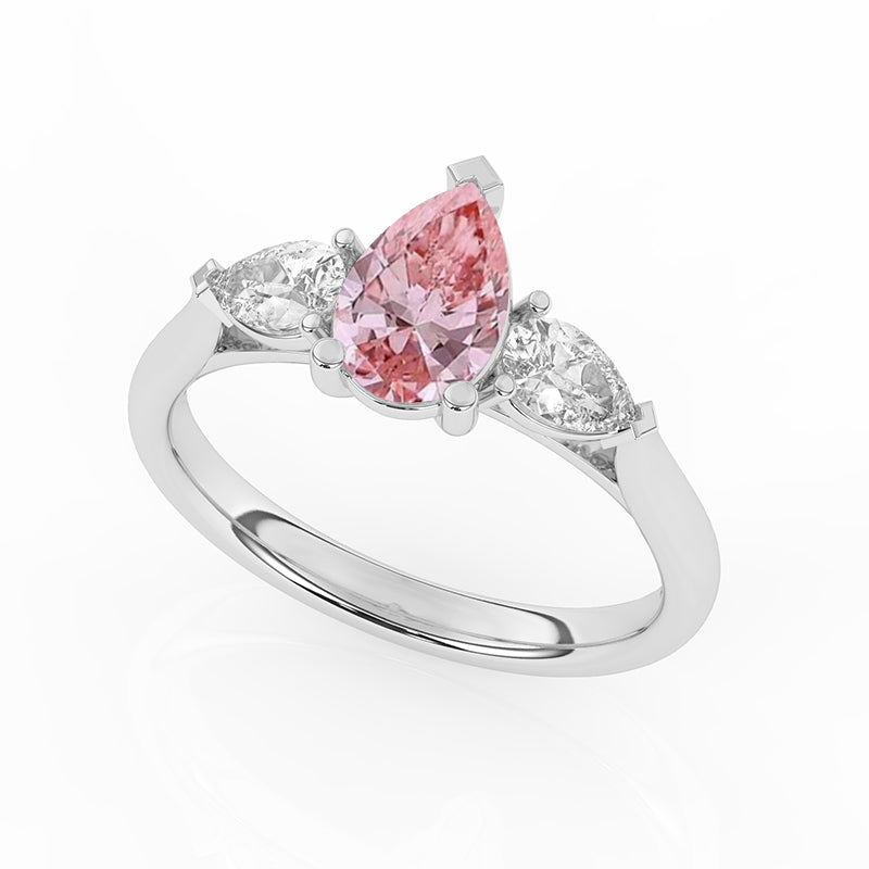 Description: Diamond Three Stone Ring, Set with Pear Cut Lab Pink Diamond & Two Pear Cut Lab Diamonds, Set in 9ct or 18ct White Gold or Platinum (Verifiably IGI Report Included)