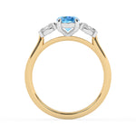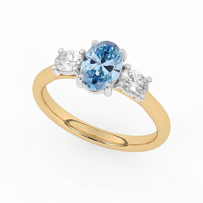 Description: Diamond Three Stone Ring, Set with Oval Cut Lab Blue Diamond & Two Oval Cut Lab Diamonds, Set in 9ct or 18ct Yellow Gold (Verifiably IGI Report Included)