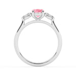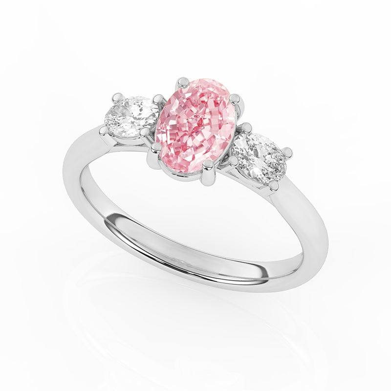 Description: Diamond Three Stone Ring, Set with Oval Cut Lab Pink Diamond & Two Oval Cut Lab Diamonds, Set in 9ct or 18ct White Gold or Platinum (Verifiably IGI Report Included)